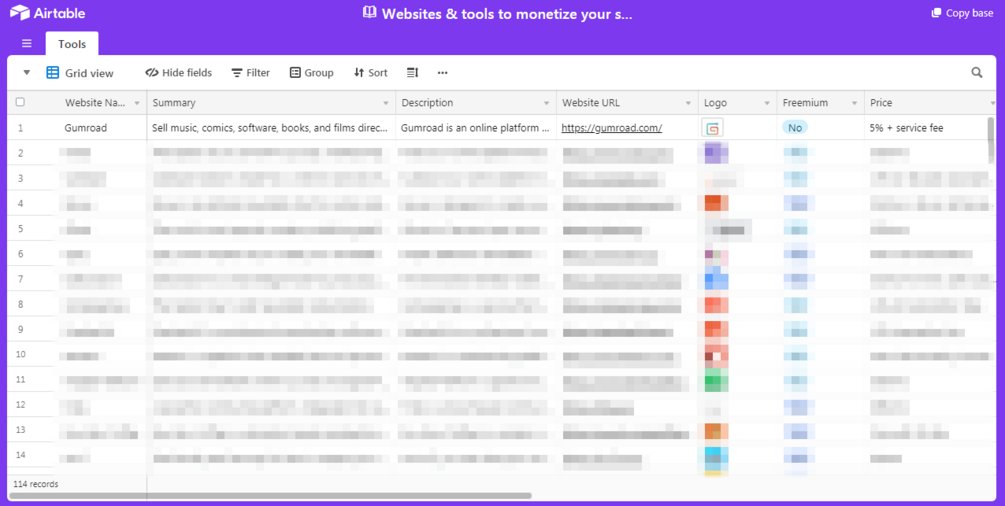 You can use this list to quickly filter, sort, or search the website by Price, Freemium, and category. Browsing this Airtable base is faster than using our static website to find the tool you are looking for.